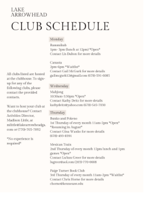 Lake Arrowhead - CLUB SCHEDULE
