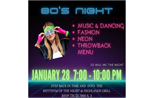 We get it, “Girls (& guys) Just Want to Have Fun” So dig in those boxes and pull out your favorite fashions from the 1980’s... “Walk This Way” to Highlands Grill to “Pump Up the Jam” and “Bust a Move” on the dance floor.