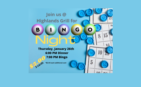 Thursday, January 26th, 2023 6:00 PM Dinner Buffet 7:00 PM @ Highlands Grill Join in the fun for a great night of Bingo and friends hosted by Eileen at Highlands Grill. Reservations are suggested $5.00/ 3 Cards $2.00/ 1 Card RSVP to 770.721.7900 x 3 |