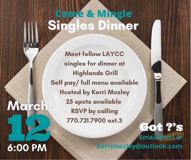 6:00 PM Come and mingle with other LAYCC Singles. Meet fellow singles for dinner at Highlands Grill for a night of fun hosted by Kerrie Mozley. Limited spots available. Full menu will be available and each person is responsible for their ticket. Call 770.721.7900 ext. 3 to RSVP. |