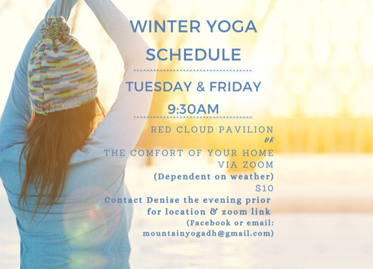 Tuesday & Friday 9:30AMRed cloud pavilion or The Comfort of your Home via ZoomContact Denise the evening prior for location & zoom link(facebook or email: mountainyogadh@gmail.com)
