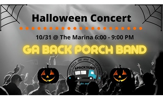 Saturday October 31st Final Concert Series w/ GA Back Porch Band and 6 Pack Subs 6pm at the Marina Wind down your Halloween weekend with music under the stars! Come join us for the last concert of the series! Enjoy amazing Asian inspired food from 6 Pack Subs and the fun and funky styling of GA Back Porch Band. View More Details about the Concert Series Here |